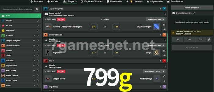 O 799g oferece uma grande seleção de opções de apostas em e-sports com probabilidades competitivas